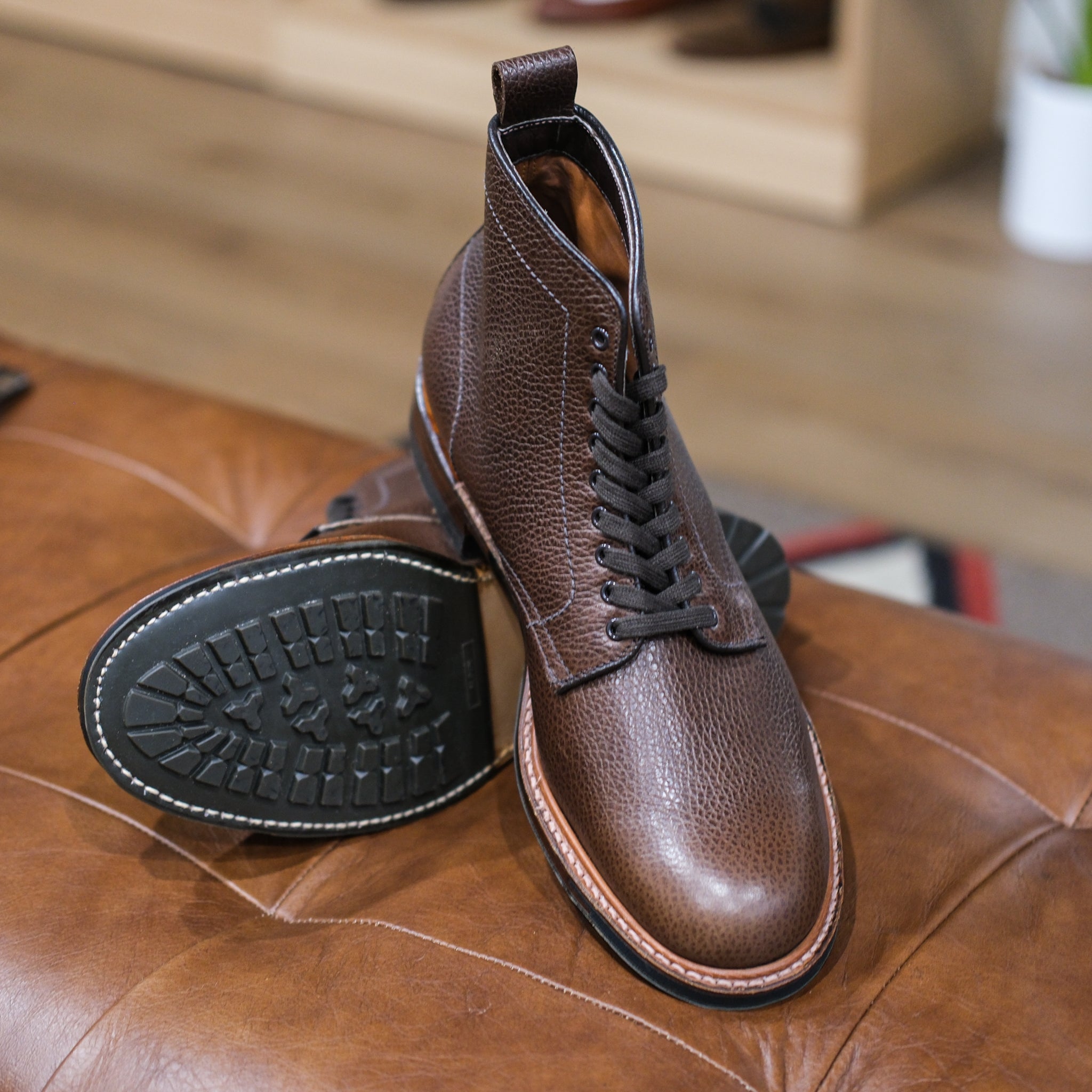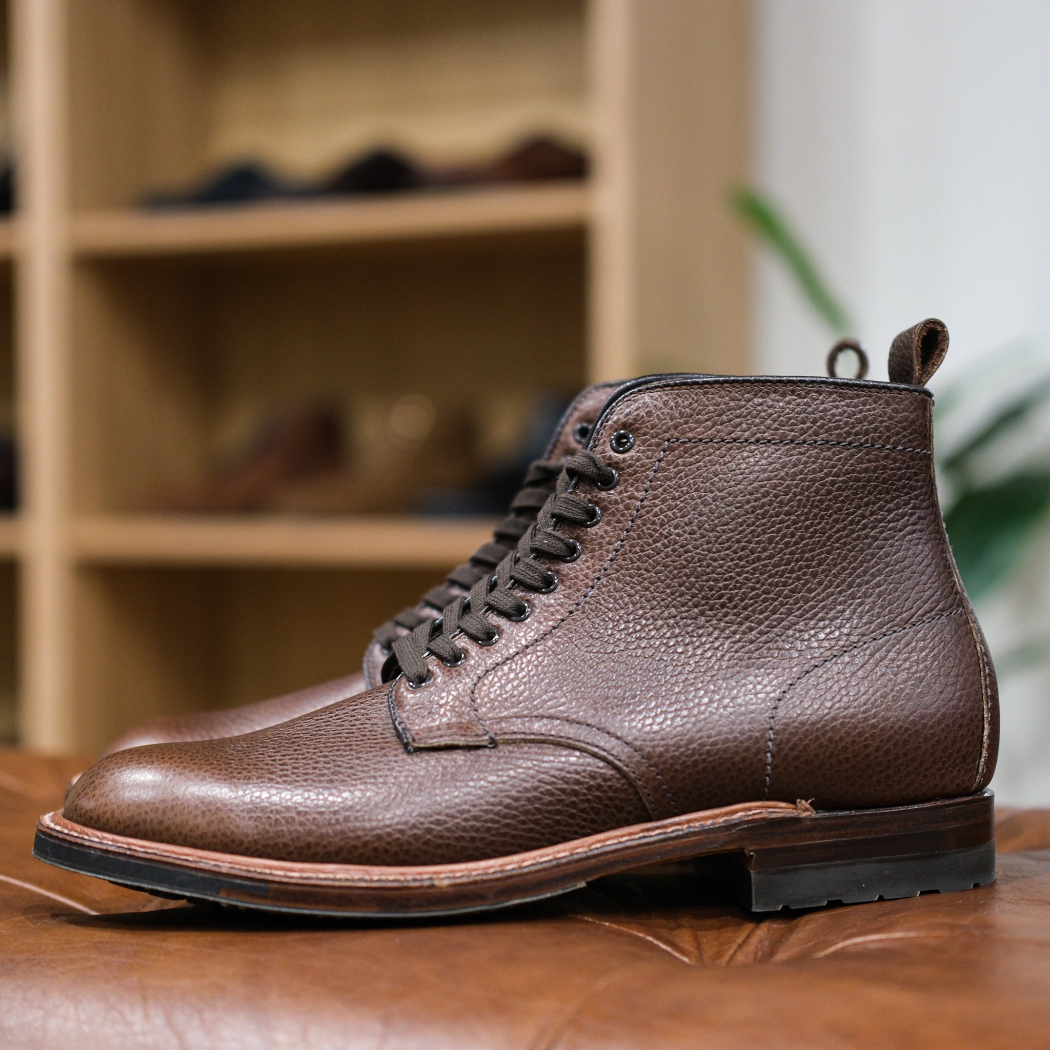 The Alden x Brogue San Mateo Plain Toe Boot takes its cues from classic American military field boots, built with purpose and durability at the forefront. Crafted in rugged Dark Brown Country Grain leather, the textured hide offers resilience against the elements while developing character with wear. The 379X last provides a structured, utilitarian silhouette, complemented by a 270-degree storm welt for added protection in wet conditions. Underfoot, a commando sole delivers dependable traction and stability, ready for demanding terrain. Finished with an antique edge and traditional Goodyear welt construction, this USA-made pair embodies the disciplined, no-nonsense spirit of vintage service footwear — built to endure, not to impress.