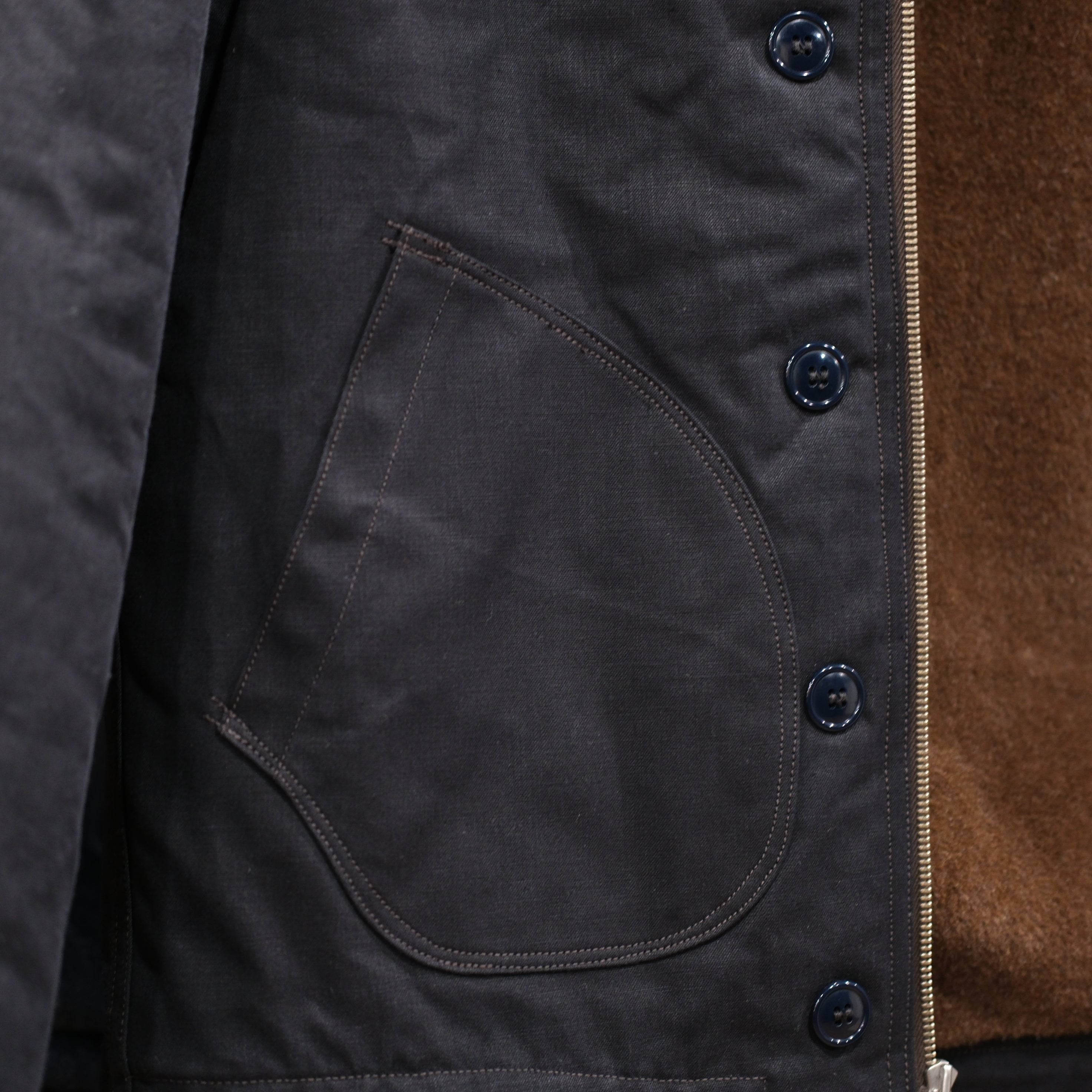 The outer shell uses Freewheelers’ original cotton-duck fabric made from five types of slub yarn, finished with a firm, crisp hand. Inside, the jacket features a 100% alpaca pile lining—dense yet soft—combined with a flannel interlayer for a warm three-layer construction.
