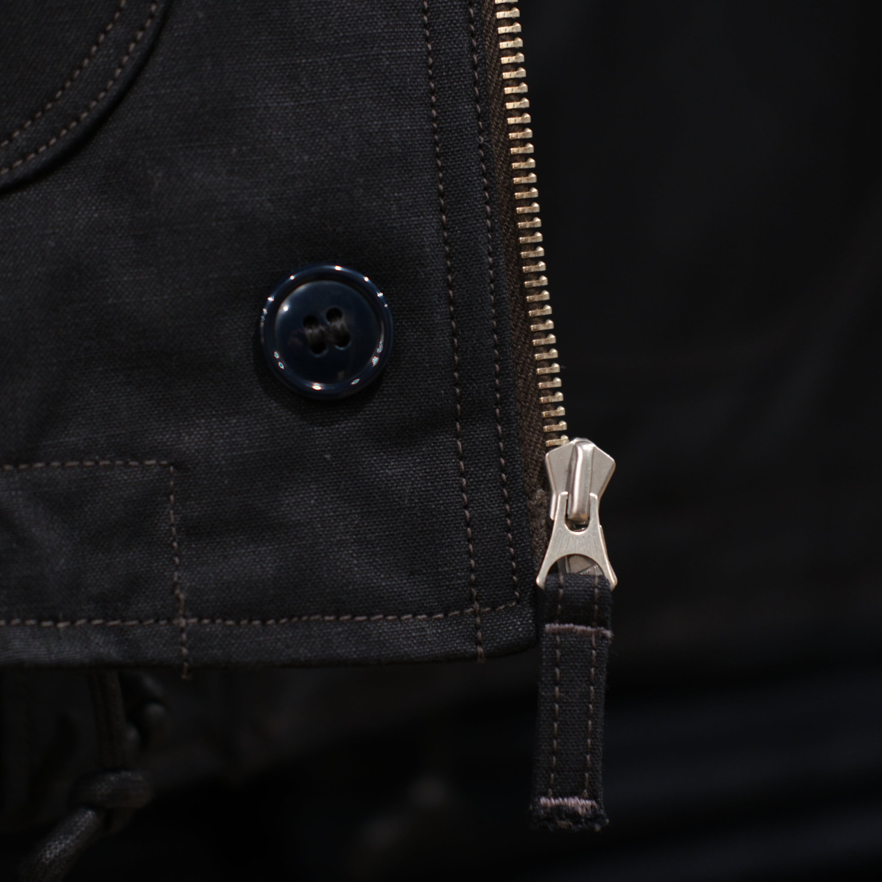 Details include a ribbed collar, 1940s-style zipper with urea buttons, rounded patch hand pockets, underarm ventilation eyelets, inner rib cuffs, hem drawcord, and an interior pocket. The zipper runs partially into the ribbed collar.