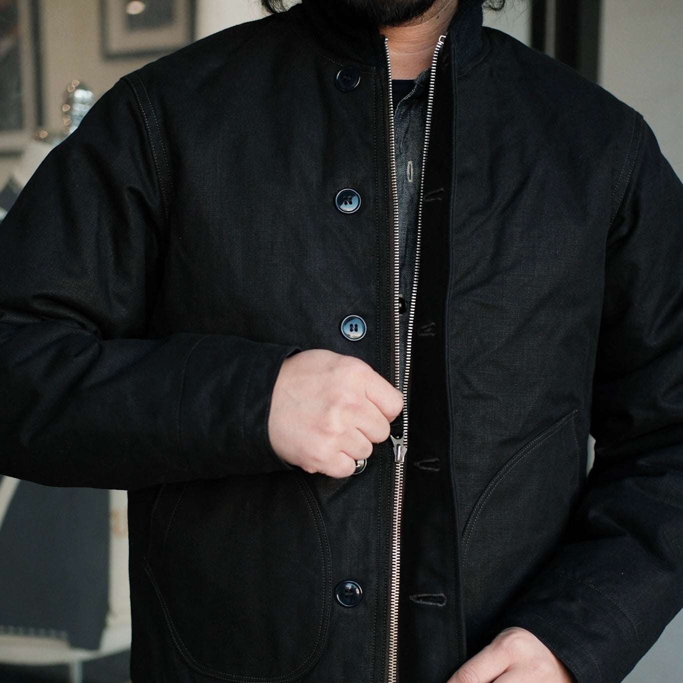 Introducing the Civilian Deck Jacket from Freewheelers’ Union Special Overalls line. Inspired by late-1930s to 1940s deck jackets, this model blends elements of U.S. Navy deck zip jackets and the early N-1.
