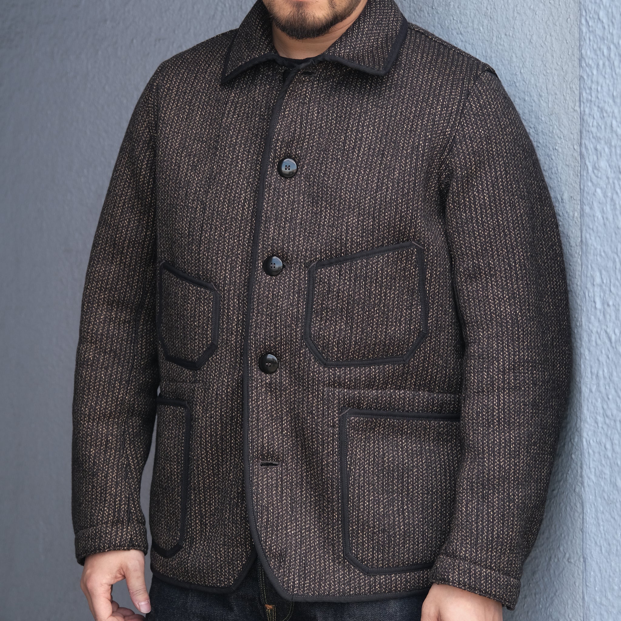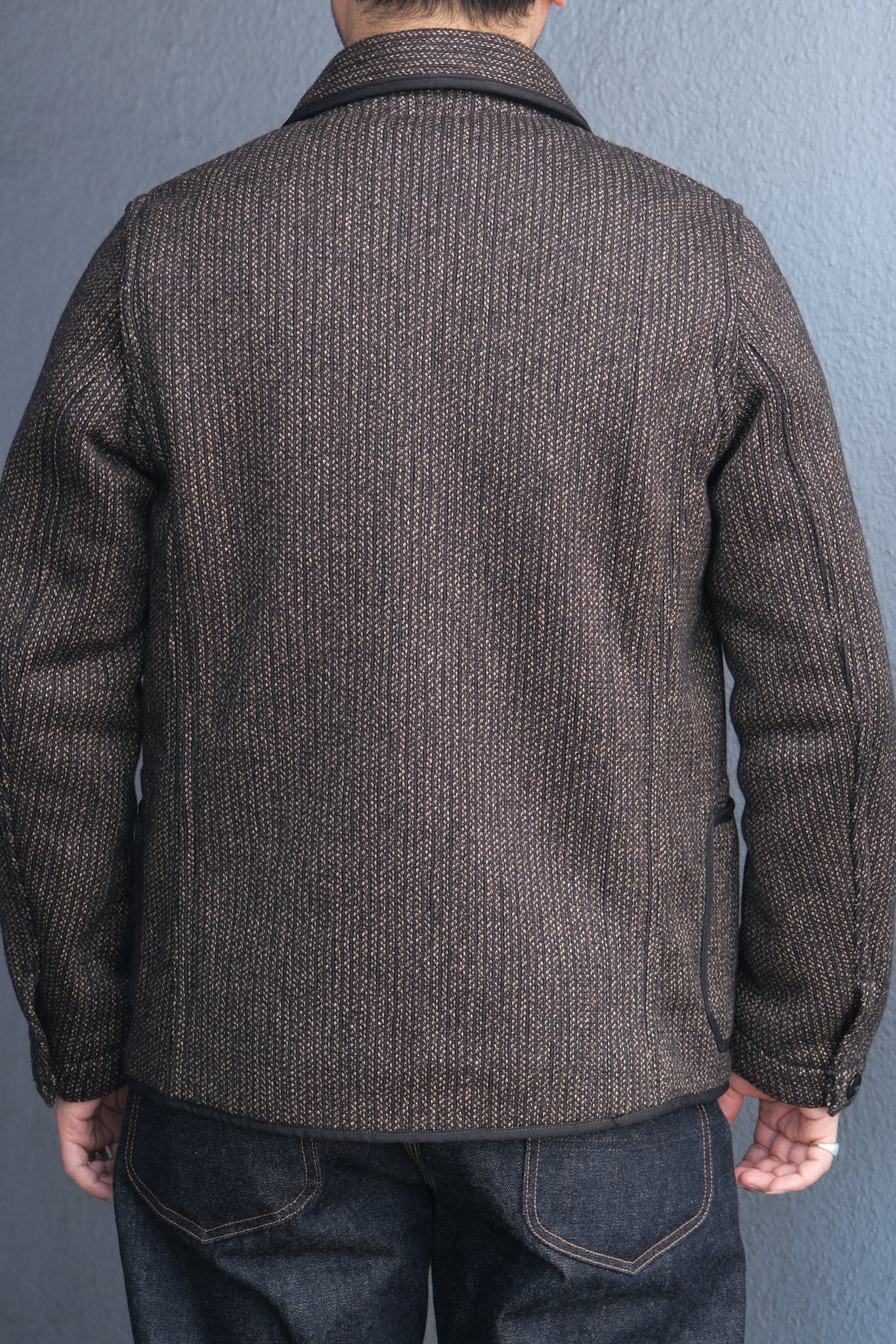 The jacket is crafted from a salt-and-pepper textured fabric often referred to as “beach cloth,” produced on a Russell knitting machine. The fabric features a black base with a pronounced striped appearance and is composed of 70% wool and 30% cotton. Developed exclusively by the brand, this original material emphasizes both texture and depth while maintaining the classic look associated with vintage beach cloth.