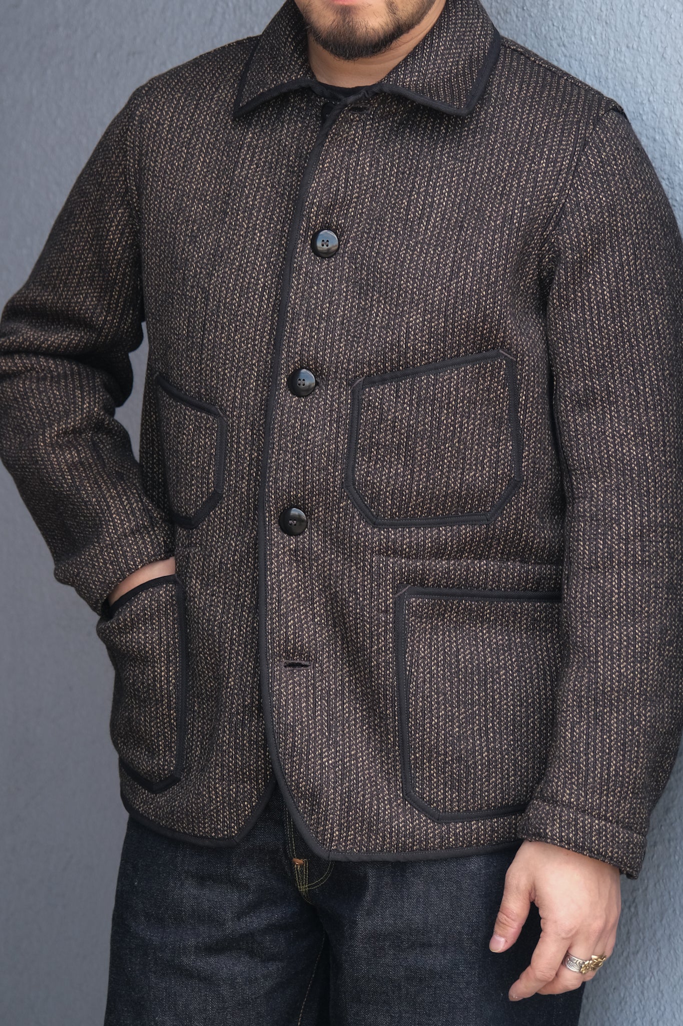 The jacket is finished with plain nut buttons, while the upper section of the waist pockets is reinforced internally with cotton moleskin for added strength. Herringbone-woven piping tape is used throughout the construction, selected specifically for its ability to age beautifully—gradually fading over time to develop richer character and texture with wear.