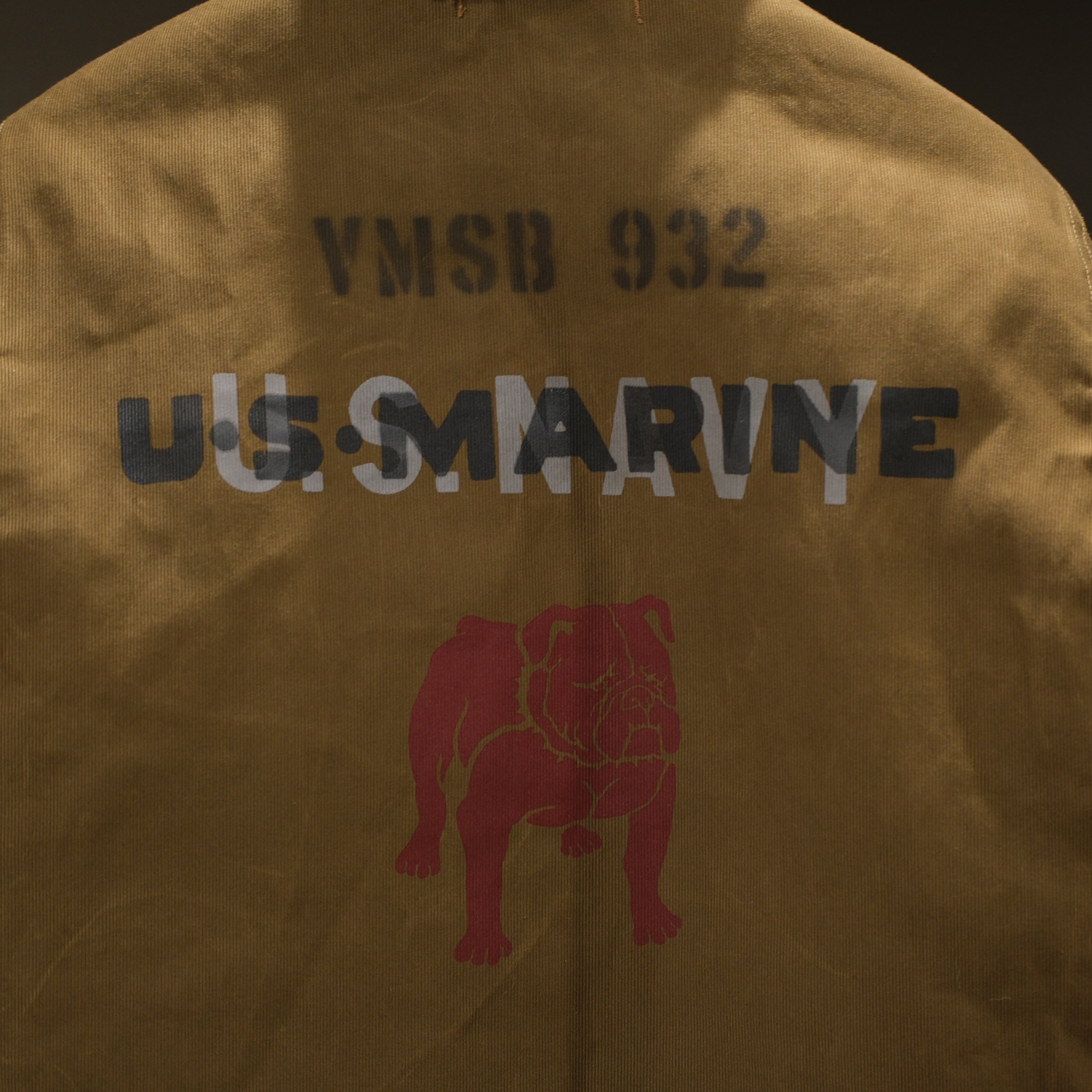 This piece is a custom model, based on the idea of a Navy jacket later repurposed by the Marine Corps. It features a “USN” stencil with an airbrushed USMC emblem, plus a rear “US MARINE” overprint and bulldog graphic. On the chest is a locally-made-style felt patch for Marine Scout Bombing Squadron 932 “TEUFELHUND” (“devil dog”), active in the South Pacific around 1944.