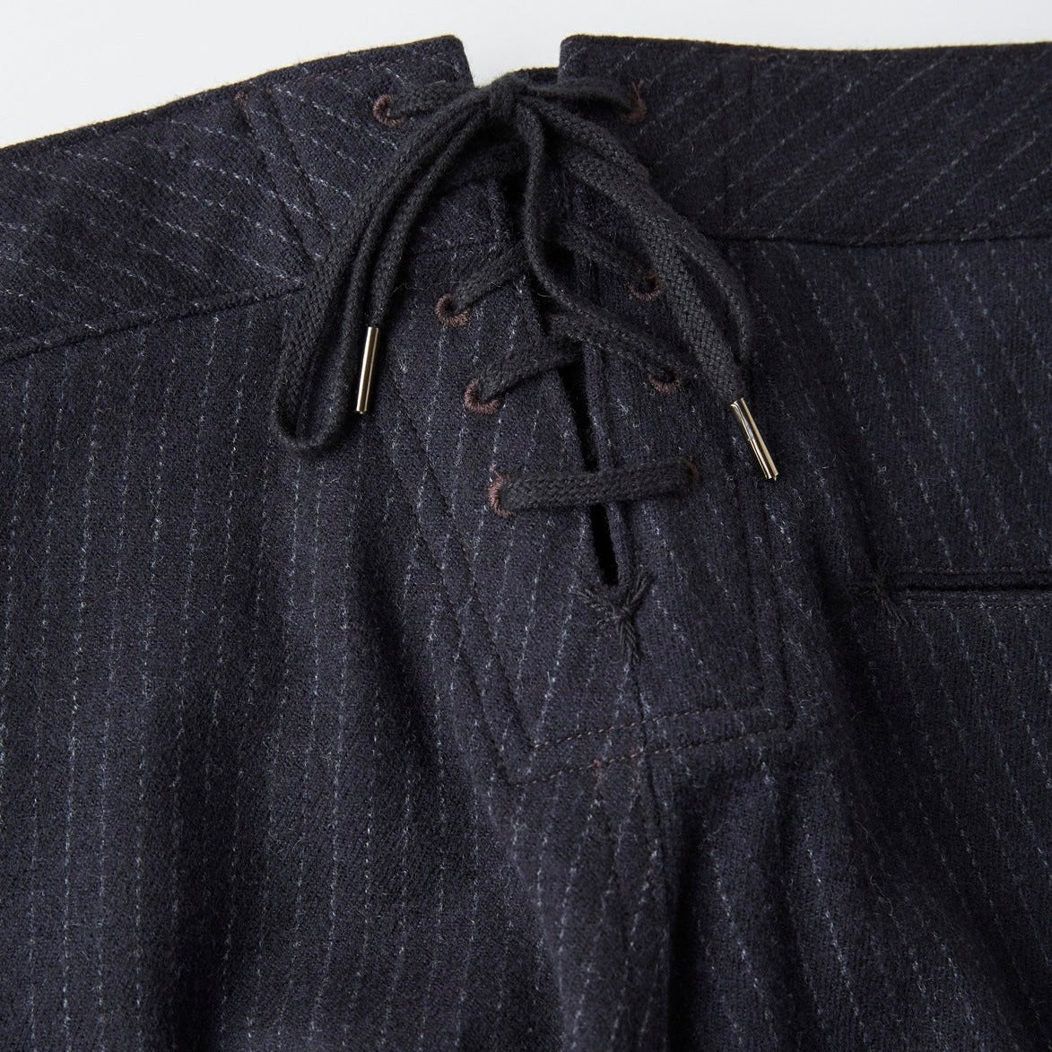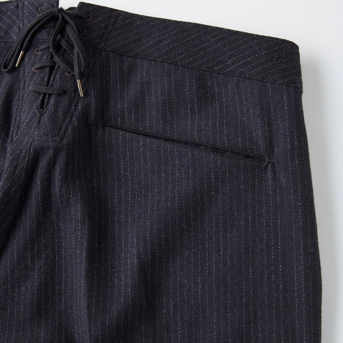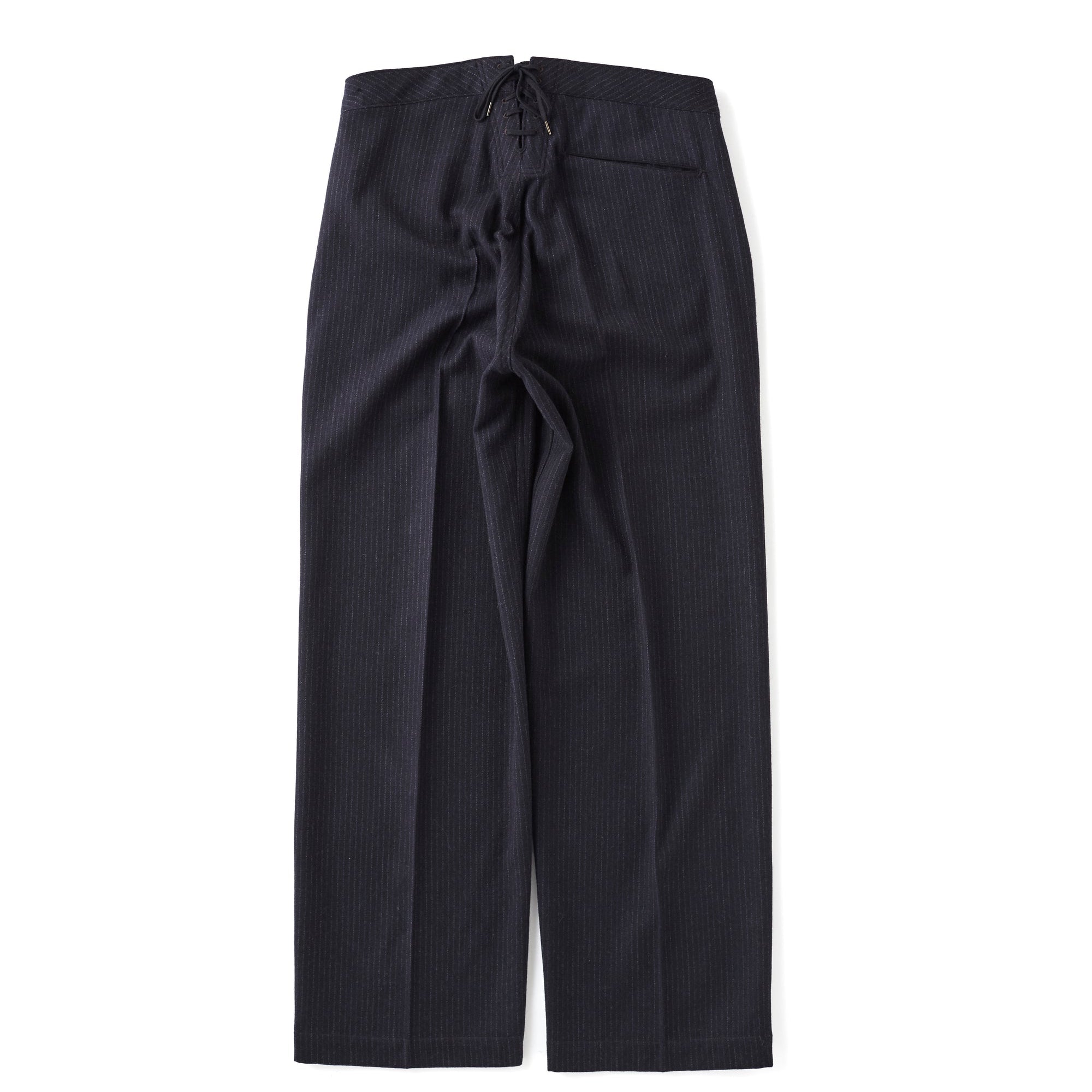 Inspired by tailor-made sailor trousers from the early era, this reimagined design blends archival character with modern comfort. Key details include a striking lace-up adjuster at the center back, a clean, non-opening sailor front, and double pockets concealed within the side seams and fly. Hand-stitched bartacks add an artisanal touch, while the internal elastic waistband ensures a secure fit despite the belt-less construction.