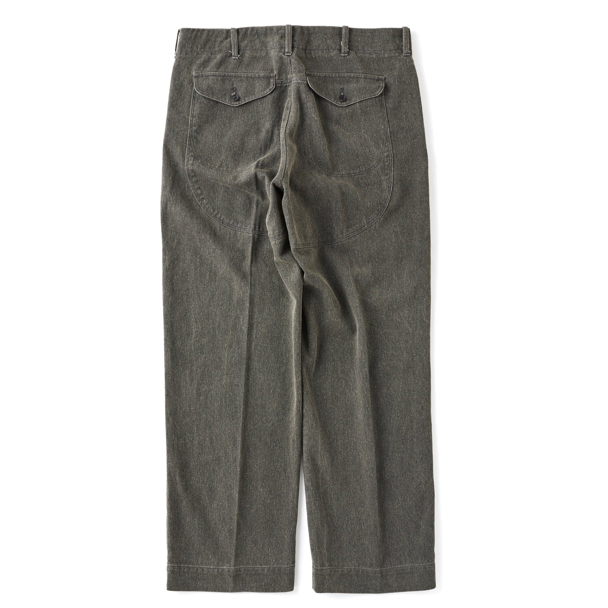 Inspired by archival pre-war European hunting trousers, this design is characterized by padded pockets arranged across the back, creating a bold yet functional silhouette. The beige-dyed katsuragi fabric is treated with a single-sided pigment coating, then carefully washed using a specialized process to achieve a naturally worn, vintage look with depth and softness.