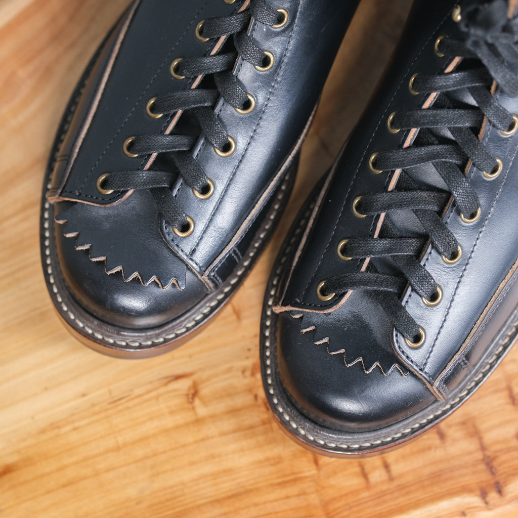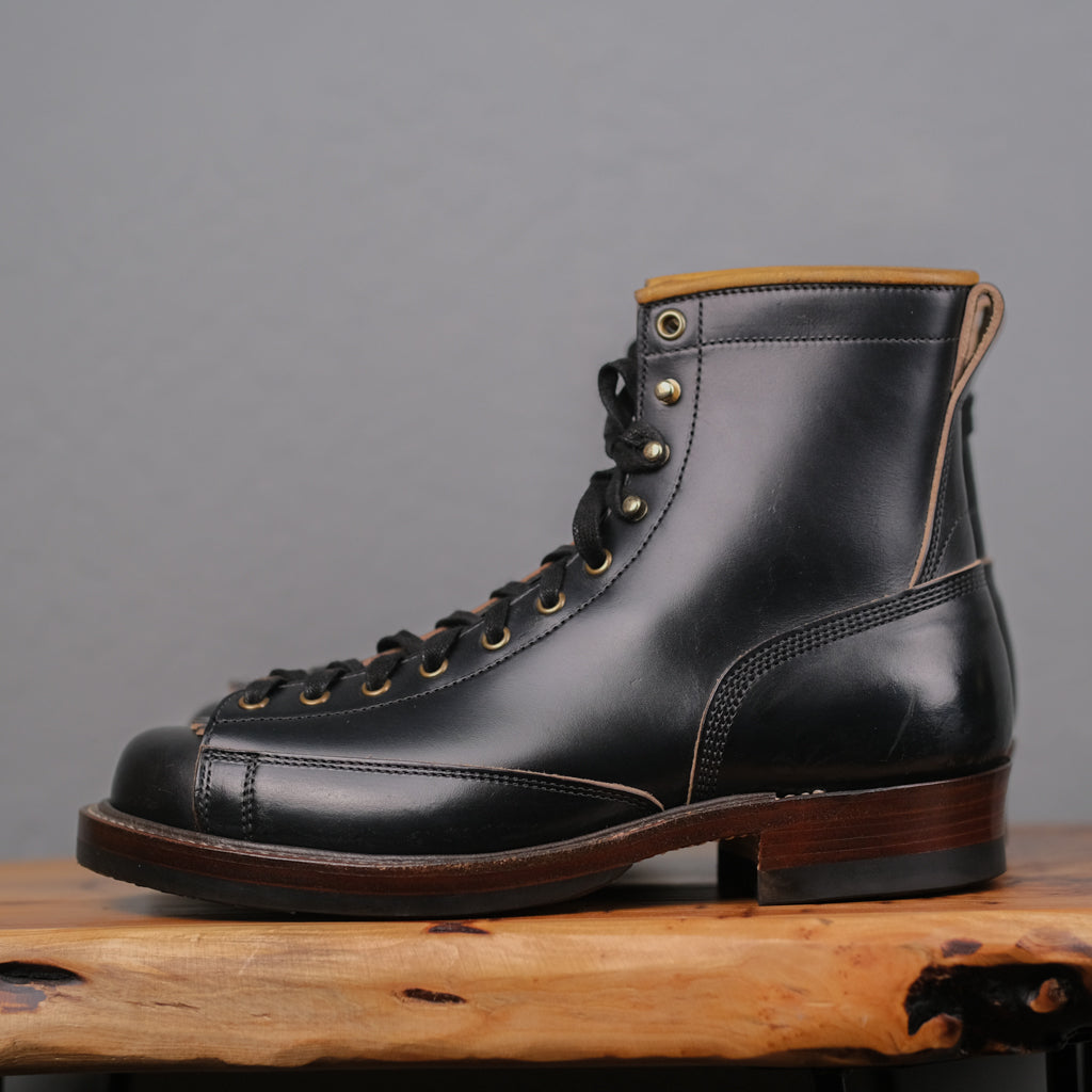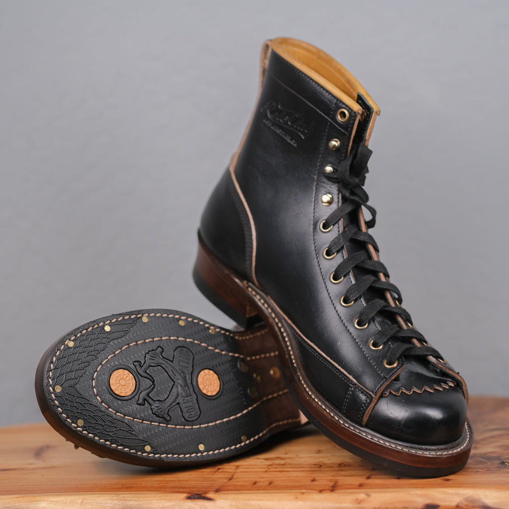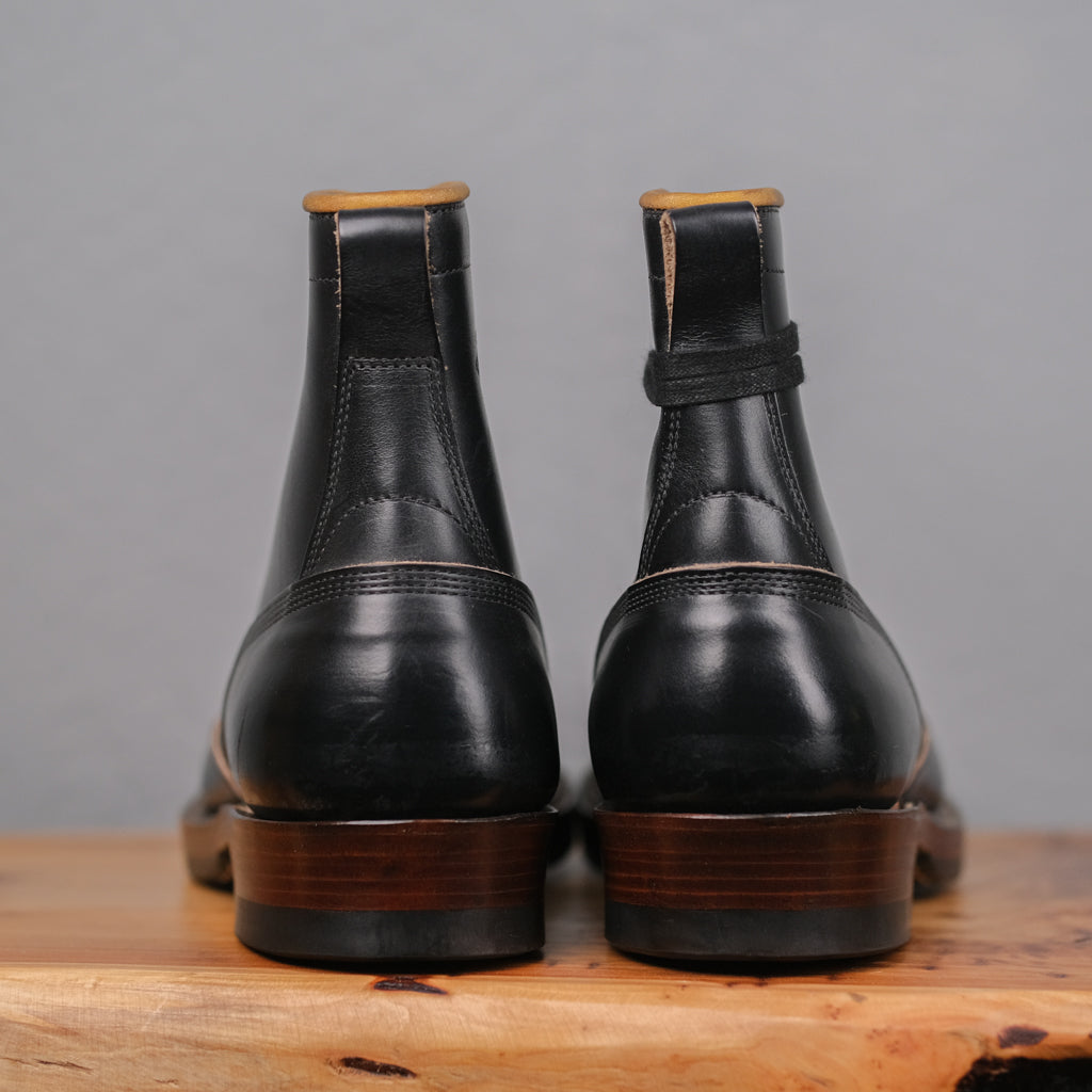 The Role Club Lace-to-Toe Boot is expertly made in Los Angeles, featuring rich Black Horween CXL leather (horsehide) and a structured toe box for a classic, refined silhouette. It sits on an RC black rubber sole with a low woodsman heel and a tonal edge finish, combining durability with subtle style. Available in size 10.5D, this boot exemplifies thoughtful craftsmanship and timeless design.