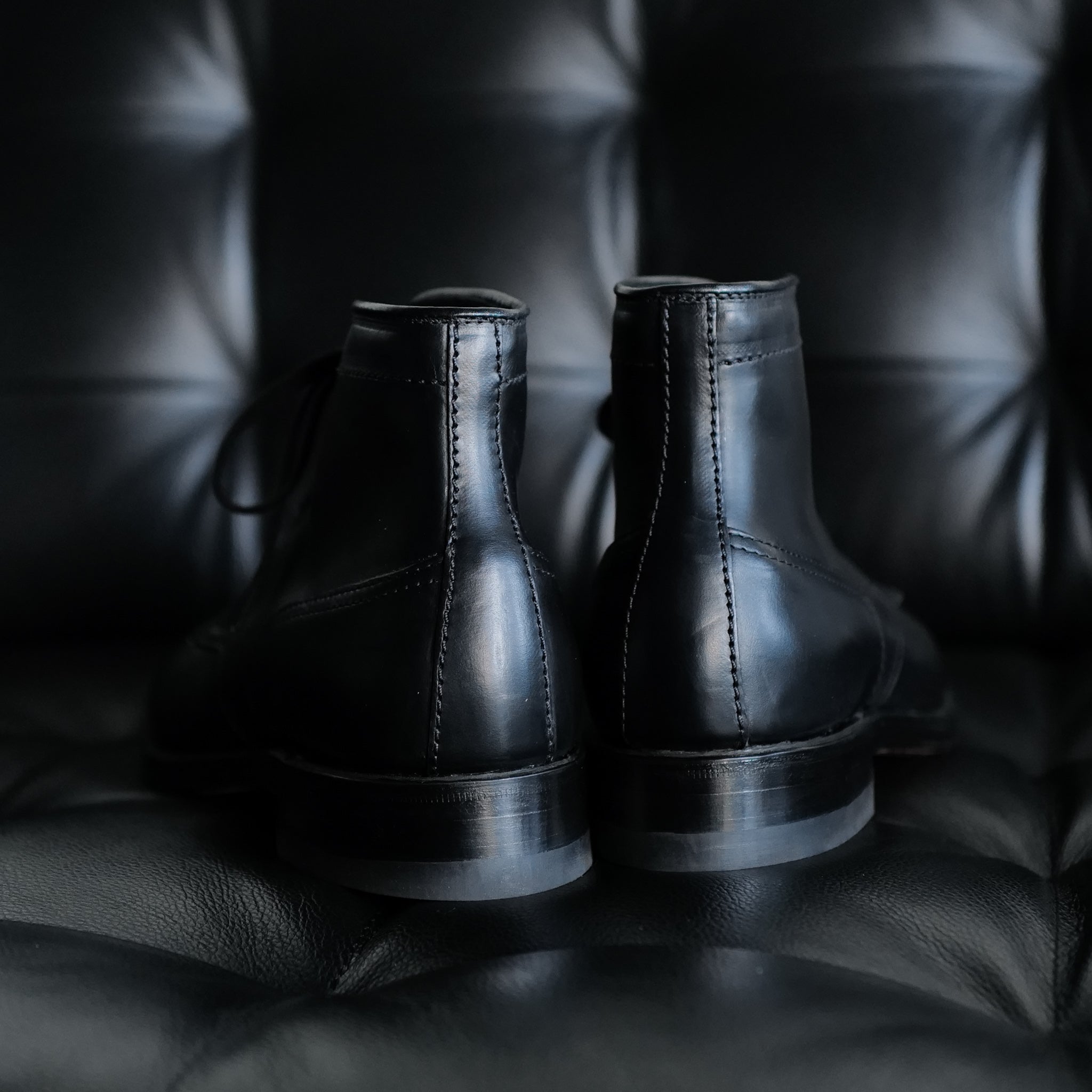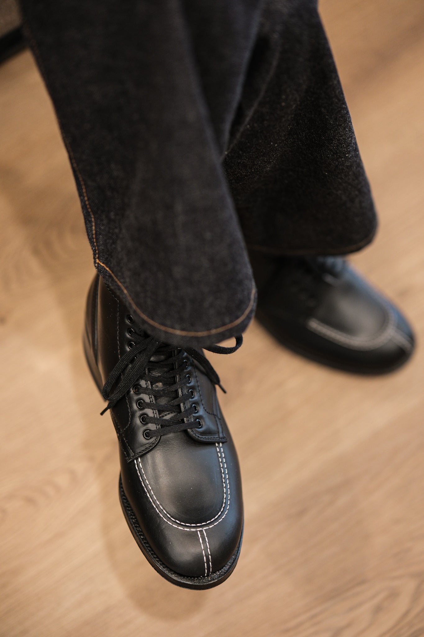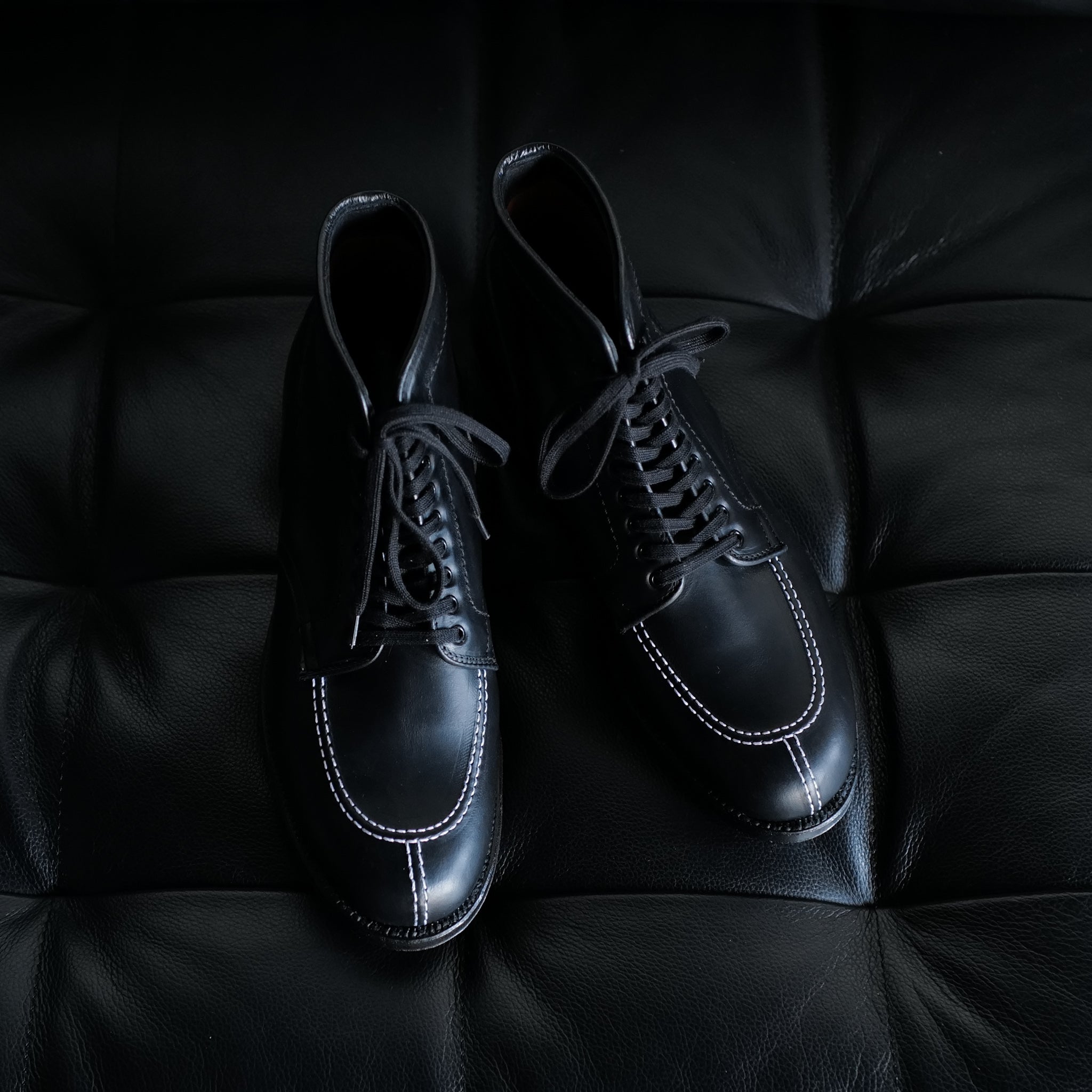 Over time, the leather will develop rich tea-core patina, revealing character unique to each pair. The most distinctive detail is the white Norwegian split-toe hand stitching, creating a bold, high-contrast statement against the black leather upper. This deliberate contrast brings the split-toe construction into sharp focus, presenting the design with a clarity and visual impact not seen before.