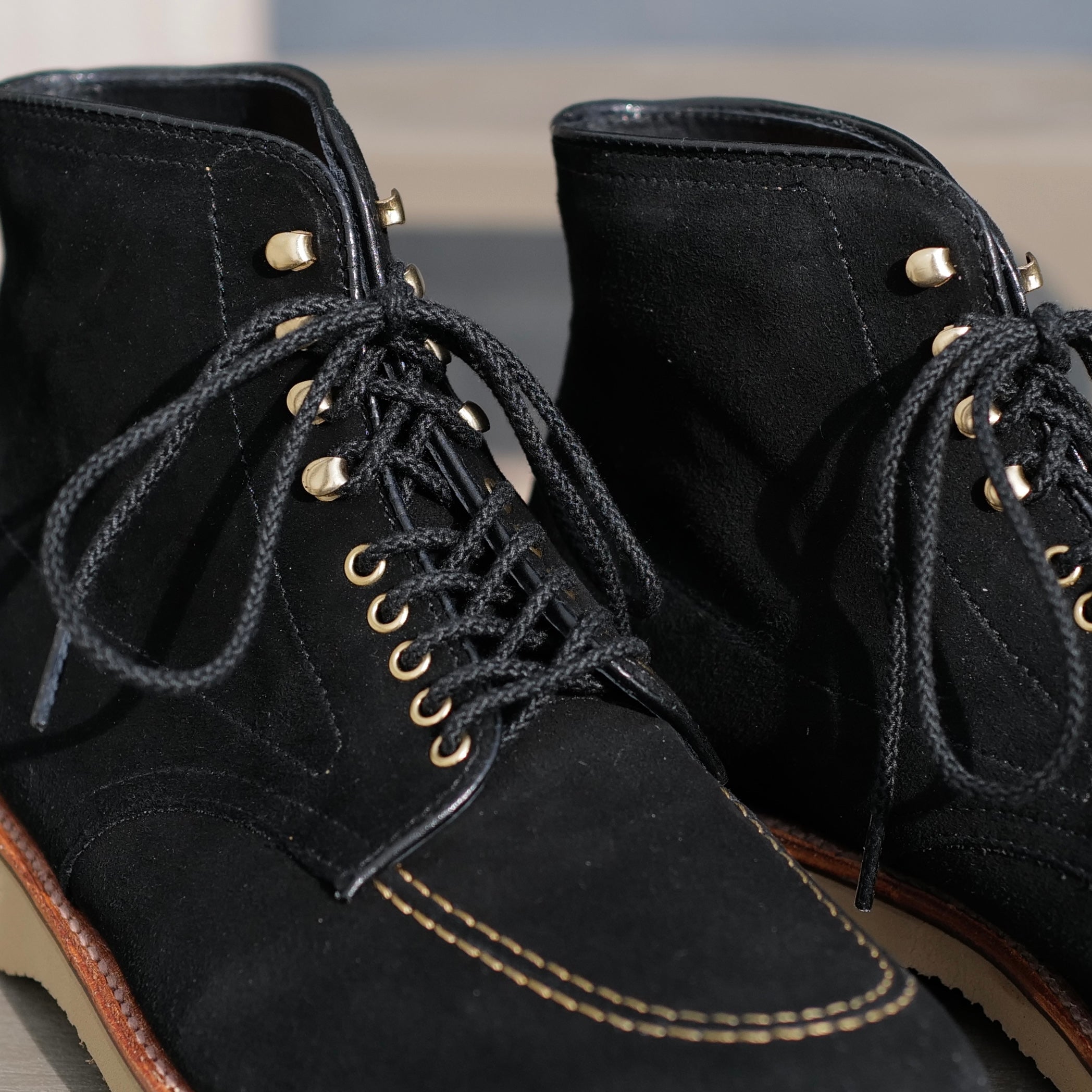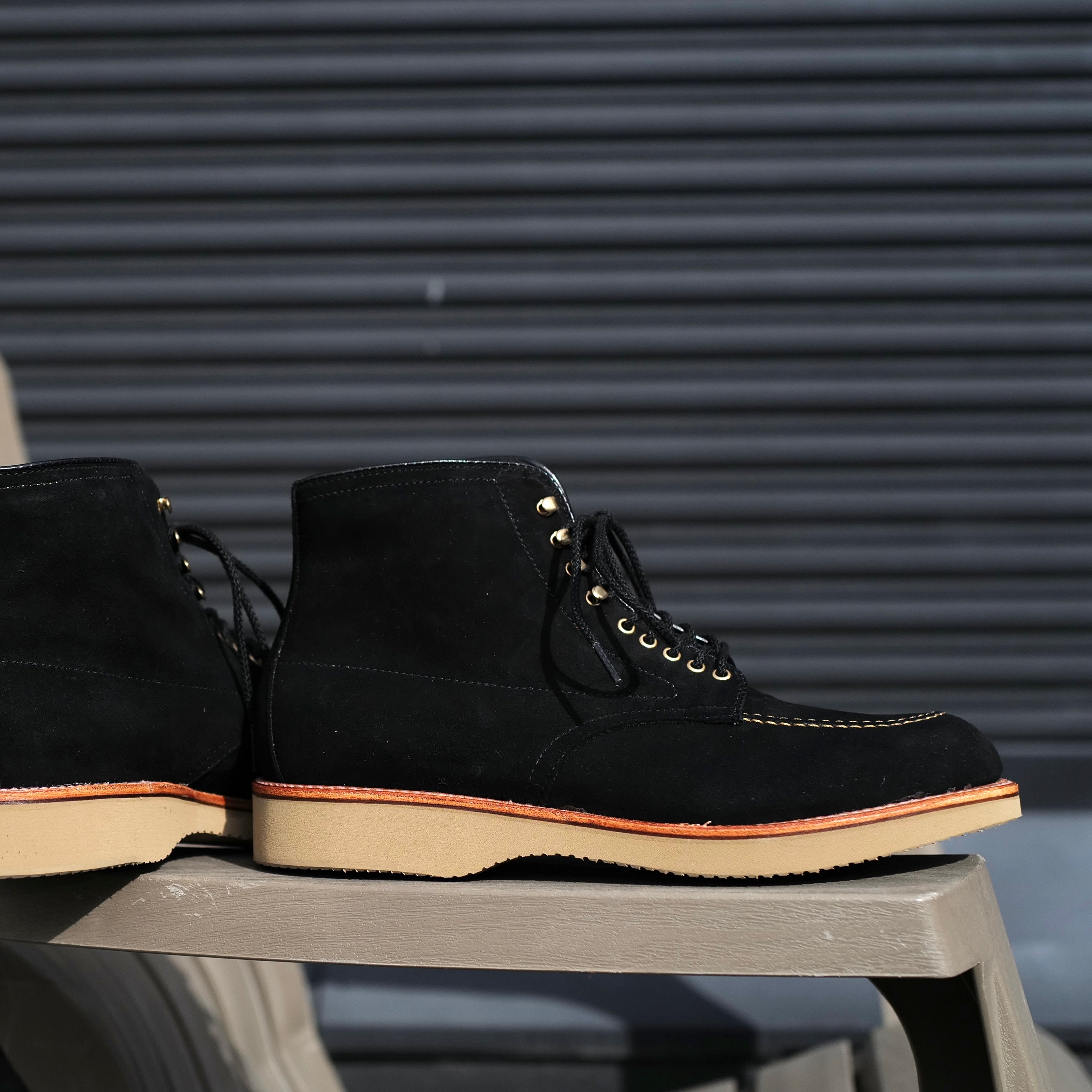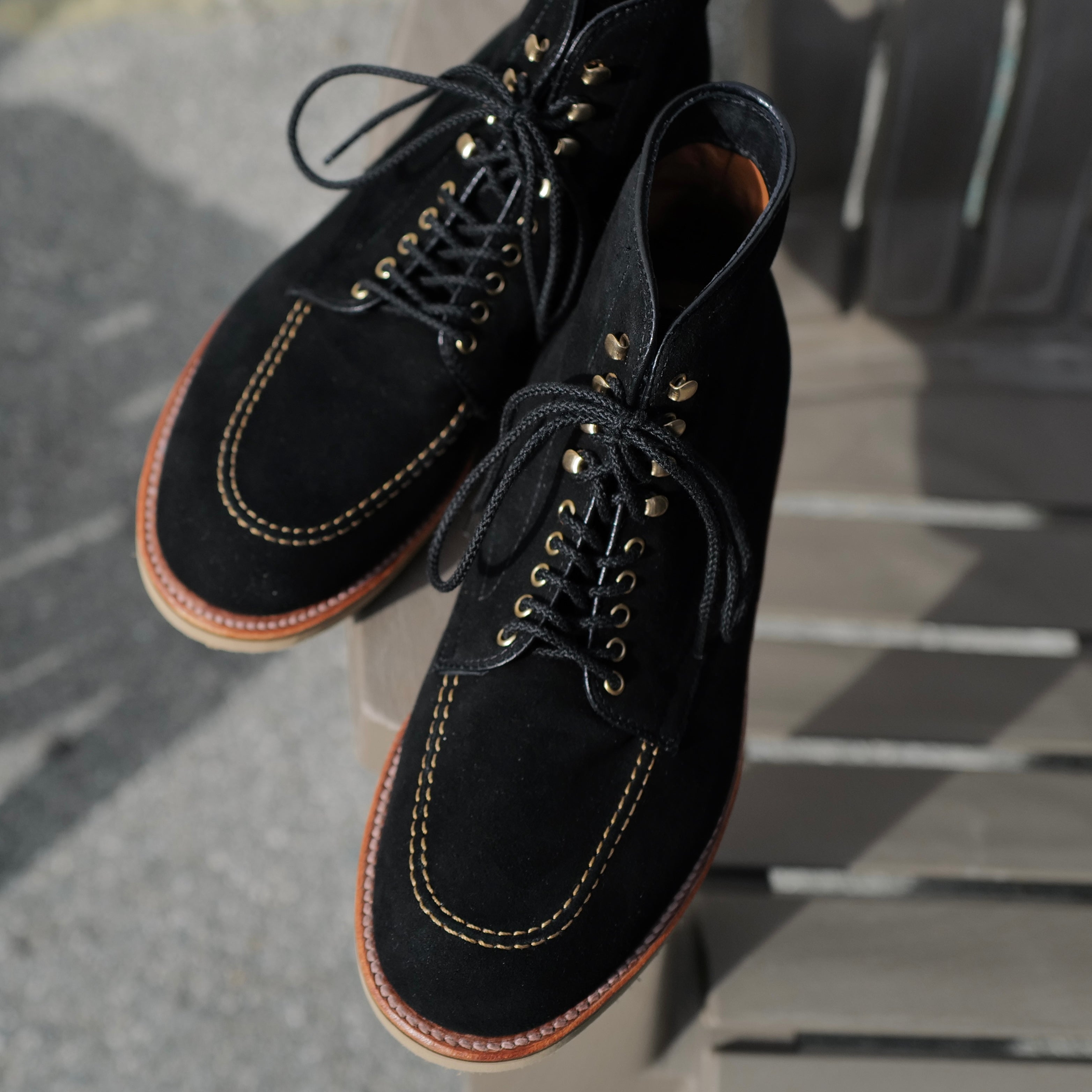 The Ridgeway Indy is built on Alden’s Trubalance last, keeping the familiar Indy shape while adding a Sahara Tan wedge sole for a lighter, more comfortable ride. Black and gold has always been our go-to combination, so we went with black suede and toned-down gold eyelets and hooks—rugged, honest, and quietly sharp. Easily to go with any selvage denims and military cargo pants. Rugged and stylish !